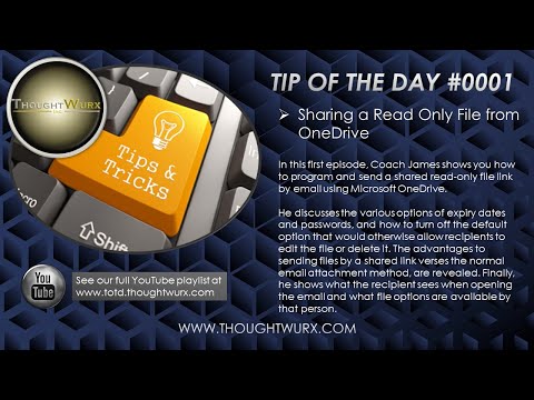 Welcome to the ThoughtWurx Tip of the Day series. In this first episode Coach James shows you how to program and send a shared read-only file link by email using Microsoft OneDrive. He discusses the various options of expiry dates and passwords, and how to turn off the default option that would otherwise allow recipients to edit the file or delete it. The advantages to sending files by a shared link verses the normal email attachment method, are revealed. Finally, he shows what the recipient sees when opening the email and what file options are available by that person. In future episodes, he shows recipients how to add shared files and folders to their existing OneDrive folder, or even to sync it to the cloud to keep current with any source updates by the sender. Coach James and associates bring you regular technology Tips & Tricks to help you manage all aspects of your digital life, safely and securely. Many interesting topics may be discussed in this series as described in the playlist header. Be sure to like and subscribe, and don't forget to the hit the bell button so you can be notified whenever a new Tip of the Day is released. Thanks for watching. The direct memorable link to this playlist is www.totd.thoughtwurx.com. Our main website is located at www.thoughtwurx.com. Please visit us soon to see how we can help you today.Education